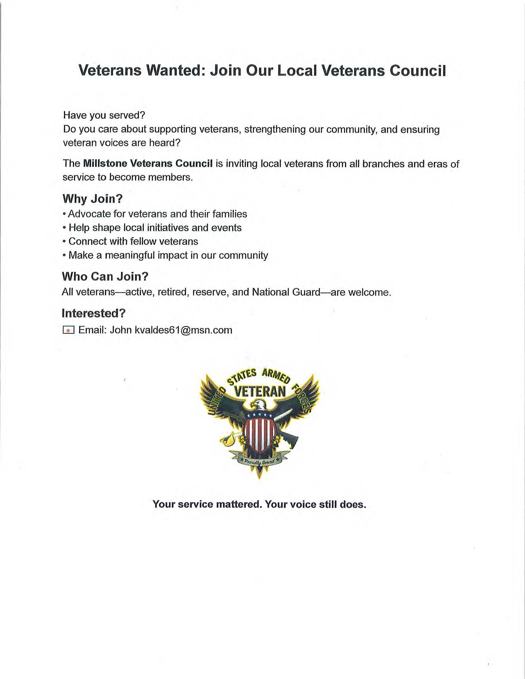 Millstone Veterans Council - Seeking New Members to help with honoring Veterans, maintaining memorials and planning local ceremonies.